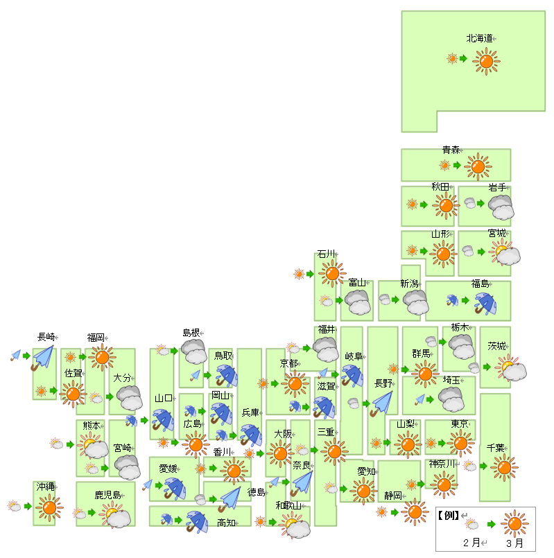 3月は「晴」が17から20地域に増加、「雨」は6から9地域に増加した。「曇」は7から9地域に増加、