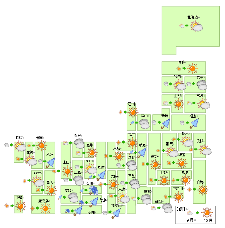 10月は「晴」が22から18地域に減少、「雨」は2から1地域に減少した。「曇」は11から9地域に減少、
