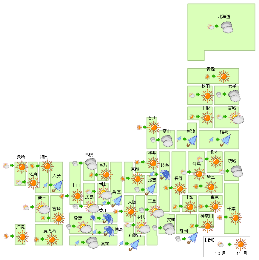 11月は「晴」が18から23地域に増加、「雨」は1から3地域に増加した。「曇」は9から7地域に減少、