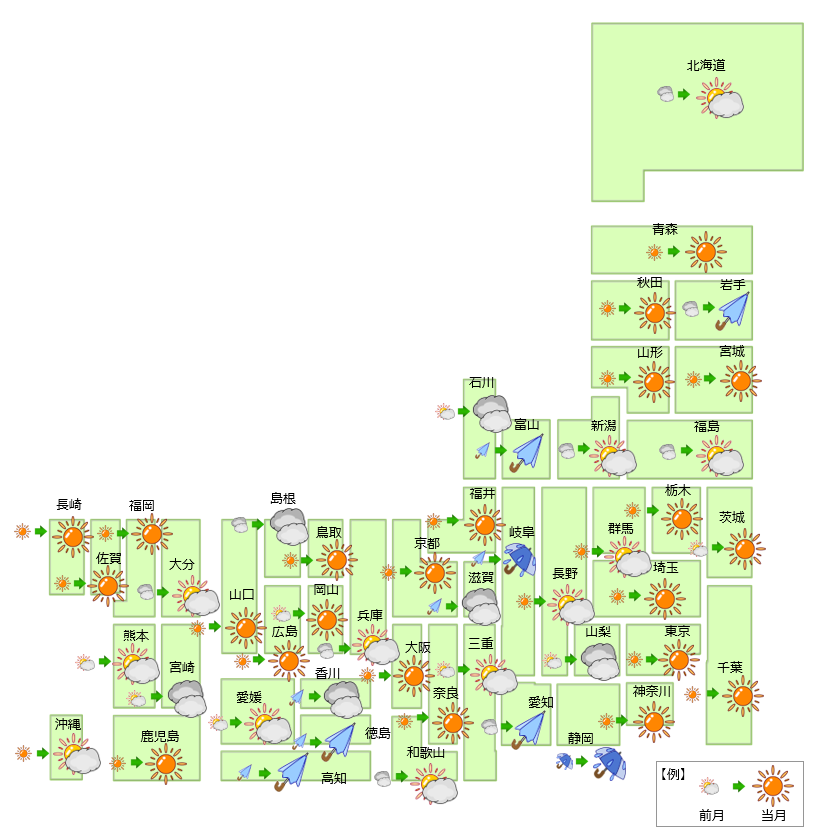 全国で天候が改善した地域数は12→10地域に減少、横ばいは29→28地域に減少、