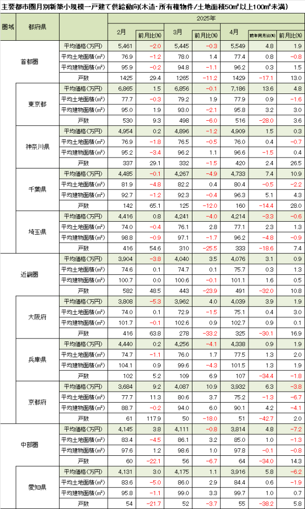 4月の首都圏新築小規模一戸建て住宅の平均価格は前月比+1.9%の5,549万円と3ヵ月ぶりに上昇した。都県別では東京都が+4.8%の7,186万円と上昇し、2014年4月の集計開始以降初の7,000万円台。神奈川県は+0.3%の4,909万円と小幅な上昇。千葉県は+10.9%の4,733万円と3ヵ月ぶりに上昇した。前年10月の最高価格はやや下回ったものの、前年同月比で見ても高い水準にある。埼玉県は-0.6%の4,214万円と下落が続き、前年同月比もマイナスに振れた。4月は埼玉県のみ下落した。
