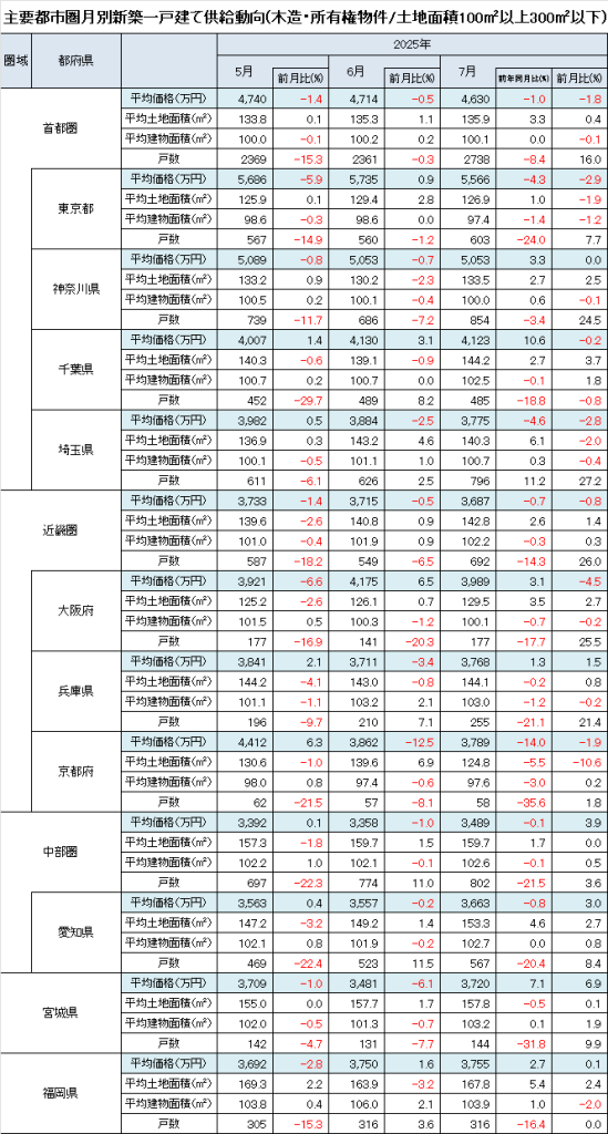 7月の首都圏新築一戸建て住宅の平均価格は前月比-1.8%の4,630万円と3ヵ月連続で下落した。都県別では東京都が-2.9%の5,566万円と下落し前年同月も下回った。神奈川県は5,053万円で横ばい。千葉県は-0.2%の4,123万円と3ヵ月ぶりに下落したが、前年同月比は10%超を維持している。埼玉県は-2.8%の3,775万円と下落が続いた。4ヵ月ぶりに下落から脱した神奈川県を除き、3都県が下落。首都圏全体では前年同月比もマイナスの水準となっている。