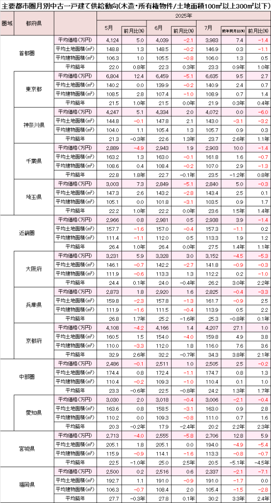 7月の首都圏中古一戸建て住宅価格は、前月比-1.4%の3,983万円と連続で下落した。平均築年は前月から1年進んでいる。東京都は+2.7%の6,635万円と上昇。前年同月比は+9.5%と拡大した。神奈川県は前月に引き続き築年数が1年以上進み、価格は-6.0%の4,072万円と3ヵ月ぶりに下落した。千葉県は-1.4%の2,903万円と下落。埼玉県は平均築年が+1.4年と築古化し、-0.3%の2,840万円と下落が続いた。
