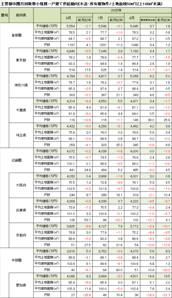 愛知県は+13.5%の4,501万円と大きく上昇。名古屋市の価格上昇が影響し、前年同月比で見ても高い水準になっている。中部圏全体(4県)も+8.3%の4,073万円と上昇し、前年同月を+5.6%上回っている。