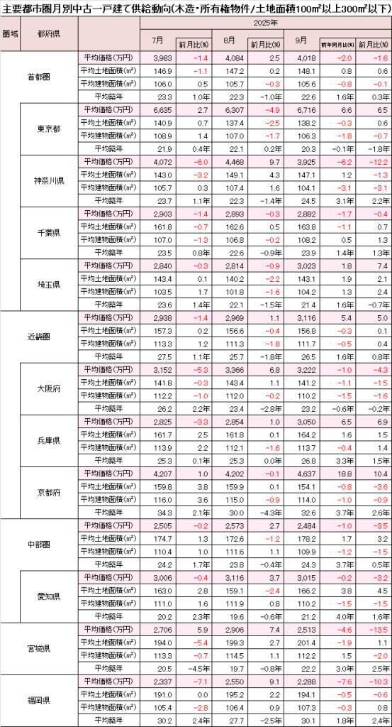 愛知県は-3.2%の3,015万円と再び下落した。前月比・前年同月比ともに、平均土地面積が拡大したものの、築年数が進み価格が下落している。中部圏(4県)全体も同様で、-3.5%の2,484万円と下落した。