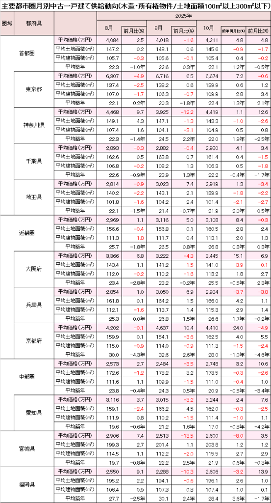 宮城県は+3.5%の2,600万円と上昇した。前年同月比は引き続きマイナスとなっている。福岡県は+13.9%の2,606万円と、前月からの反動もあり大きく上昇した。前年同月比では平均築年が+3.6年となり、価格は下回っている。