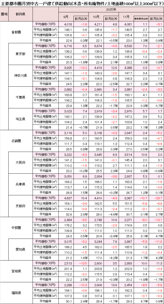 11月の首都圏中古一戸建て住宅価格は、前月比-3.1%の4,081万円と下落した。東京都は-2.1%の6,533万円と連続の下落。前年同月比では、築古化の一方で価格は上回る状況が続いている。神奈川県は-0.7%の4,388万円と下落した。小幅ながら前年同月は上回った。千葉県は-3.3%の2,881万円と再び下落。前年同月比もマイナスとなった。埼玉県は築古化したものの+1.7%の2,970万円と上昇した。