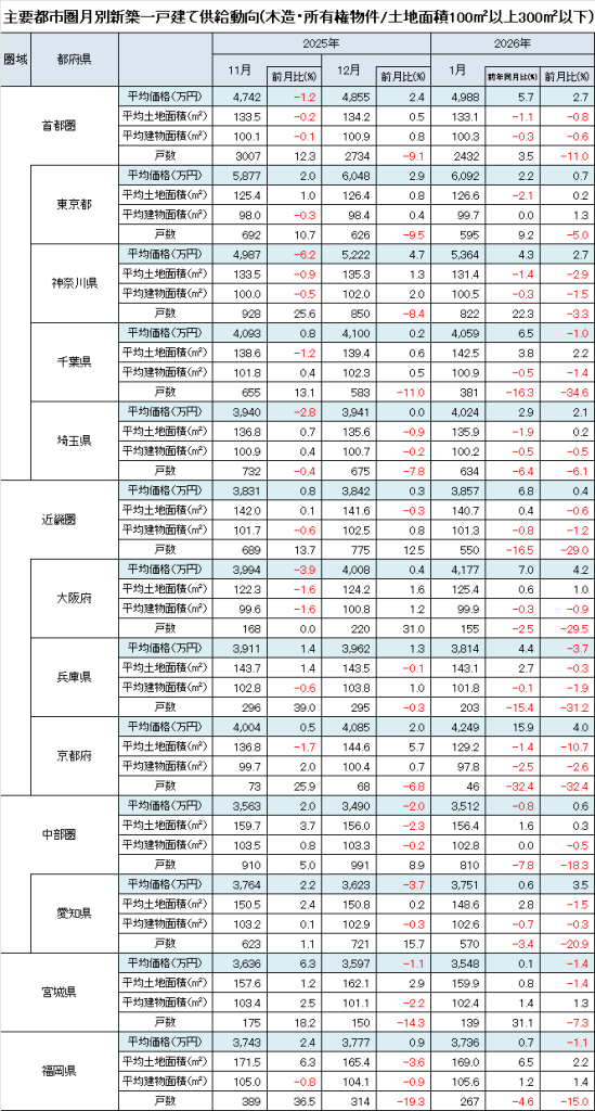 1月の首都圏新築一戸建て住宅の平均価格は前月比+2.7%の4,988万円と続伸。5,000万円に迫り、2014年4月の集計開始以降の最高価格となった。都県別では、東京都が+0.7%の6,092万円と4ヵ月連続上昇も、23区の戸数シェア縮小により鈍化。神奈川県は+2.7%の5,364万円と上昇が続いた。千葉県は-1.0%の4,059万円で、4ヵ月ぶりに下落した。埼玉県は+2.1%の4,024万円と連続の上昇。東京都は前月に引き続き6,000万円台に乗せ、集計開始以降の最高価格を更新している。