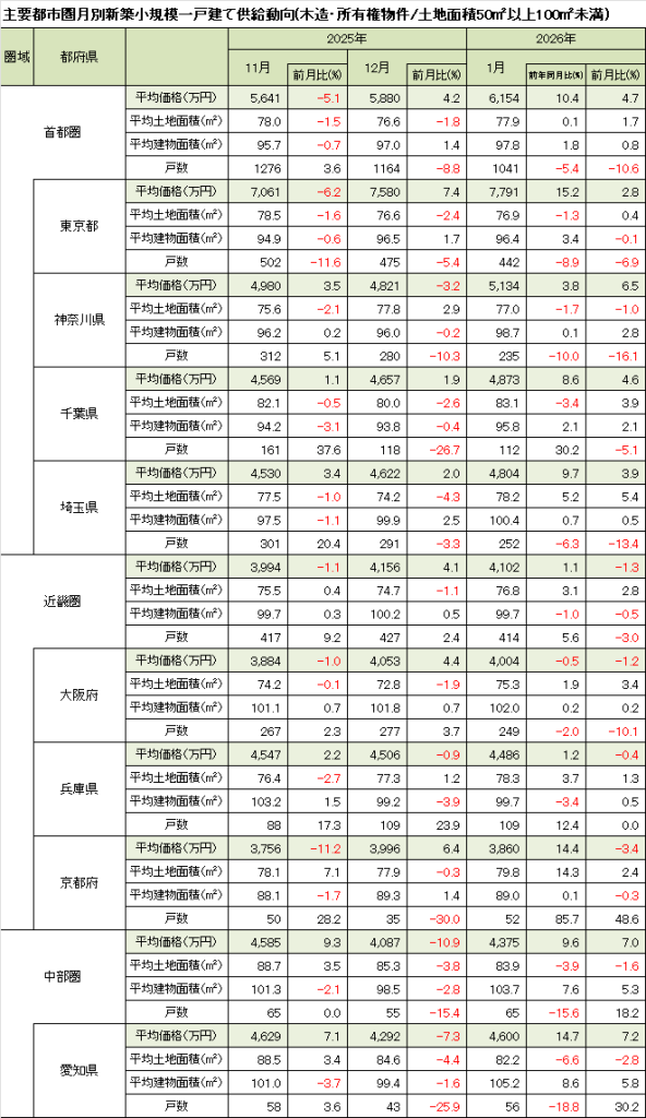 1月の首都圏新築小規模一戸建て住宅の平均価格は前月比+4.7%の6,154万円と続伸した。前年同月比は引き続き+10%前後の水準にある。都県別では東京都が+2.8%の7,791万円と上昇し、2014年4月の集計開始以降の最高価格を連続更新した。前年同月比も+15.2%と拡大。神奈川県は+6.5%の5,134万円と上昇し、4ヵ月ぶりに5,000万円台へ乗せている。千葉県は+4.6%の4,873万円と3ヵ月連続の上昇。埼玉県は+3.9%の4,804万円と4ヵ月連続上昇した。
