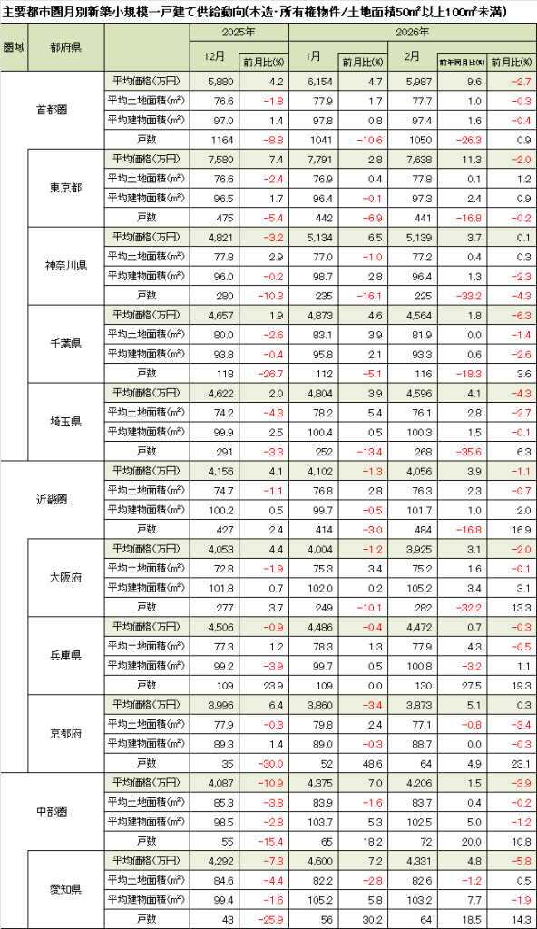 2月の首都圏新築小規模一戸建て住宅の平均価格は前月比-2.7%の5,987万円と3ヵ月ぶりに下落した。都県別では東京都が-2.0%の7,638万円と、こちらも3ヵ月ぶりに下落。前年同月比では2ケタ上昇を維持しているものの縮小している。神奈川県は+0.1%の5,139万円と僅かながら続伸し、引き続き5,000万台に乗せている。千葉県は-6.3%の4,564万円と4ヵ月ぶりの下落。埼玉県は-4.3%の4,596万円と5ヵ月ぶりに下落した。千葉県と埼玉県は、前年同月比の縮小も見られた。