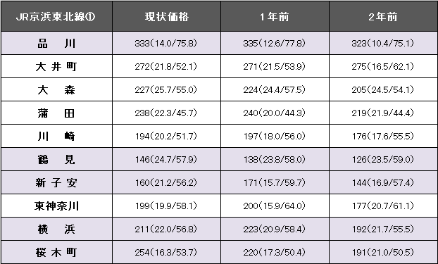 JR京浜東北線(品川~大船)における3.3平方メートル当たりの平均価格は194万円。1年前に比べて2万円、1.0%下落した。事例数は6394件(前年より350件増)、平均築年数が22.4年(1年前21.2年)、平均専有面積は59.48平方メートル(同61.28平方メートル)だった。今回掲載駅における最高値は品川の333万円。