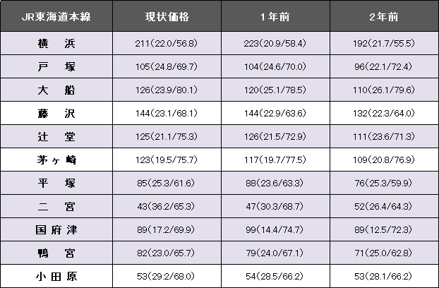 JR東海道本線(横浜~小田原)における3.3平方メートル当たりの平均価格は127万円。1年前に比べて2万円、1.6%上昇した。事例数は3786件(前年より519件増)、平均築年数が23.4年(1年前23.0年)、平均専有面積は68.22平方メートル(同68.07平方メートル)だった。今回掲載駅における最高値は横浜の211万円。