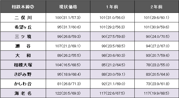 22%台の大幅上昇となった相模大塚は、事例数が20件と少ないため個別事例の影響による。ただし、隣駅のさがみ野と共に前々期からの上昇傾向を維持しており、おおむね好調と見てとれる。