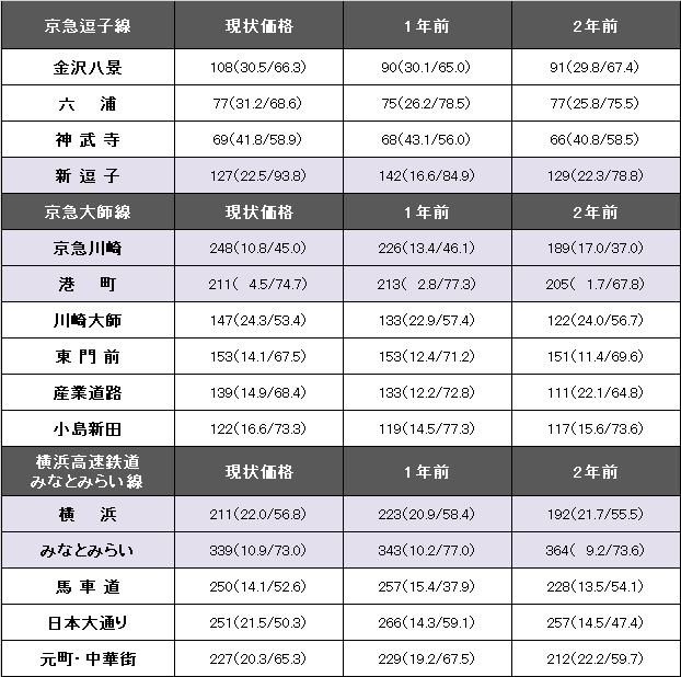 京急逗子線(金沢八景~新逗子)における坪(3.3平方メートル)当たりの平均価格は89万円。1年前に比べて4万円上昇した。事例数は274件、平均築年数が32.2年、平均専有面積は69.01平方メートル。掲載駅の最高値は新逗子の127万円。