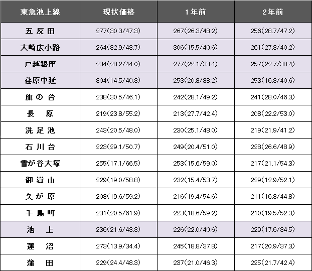 東急池上線(五反田~蒲田)における坪(3.3平方メートル)当たりの平均価格は245万円。1年前に比べて2万円、0.9%上昇した。事例数は1852件(前年より50件増)、平均築年数が24.1年(1年前22.0年)、平均専有面積は49.73平方メートル(47.30平方メートル)だった。掲載駅における最高値は荏原中延の304万円。