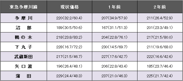 多摩川は6%の上昇。平均専有面積は拡大傾向で60㎡を超えた。築年の若返りは見られるものの、平均築年30年超という中で、平均坪単価が路線平均を上回った。