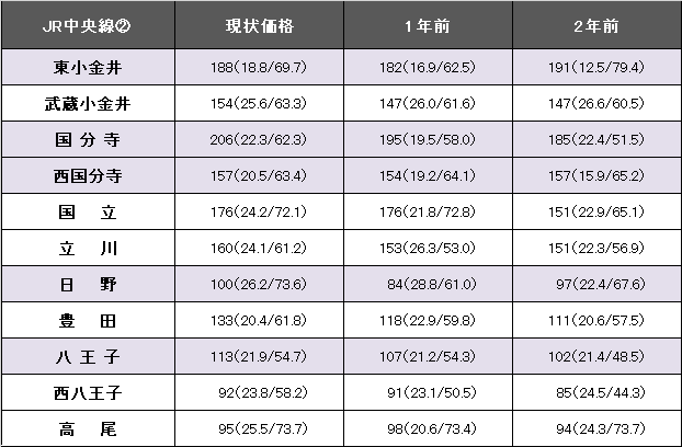 JR中央線(東京~高尾)における坪(3.3平方メートル)当たりの平均価格は201万円。1年前に比べて3万円、1.3%上昇した。事例数は5060件(前年より384件増)、平均築年数が25.2年(1年前24.5年)、平均専有面積は56.86平方メートル(同52.68平方メートル)。今回掲載区間内の最高値は国分寺の206万円。