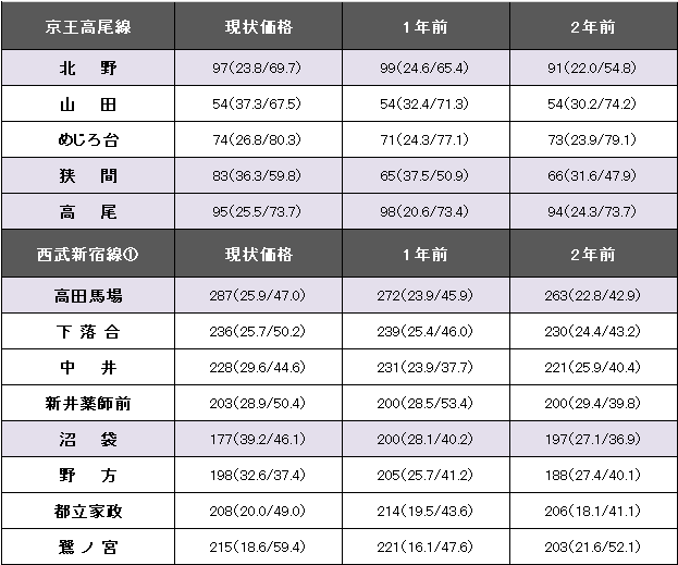 京王高尾線(北野~高尾)における坪(3.3平方メートル)当たりの平均価格は85万円。1年前に比べて5万円、6.2%上昇した。事例数は330件(前年より10件増)、平均築年数が28.1年(1年前26.6年)、平均専有面積は71.71平方メートル(同69.04平方メートル)。区間内の最高値は北野の97万円。