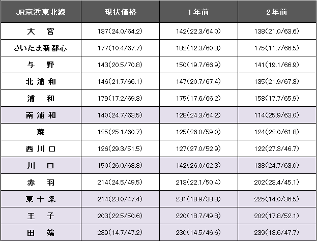 JR京浜東北線(大宮~田端)における坪(3.3平方メートル)当たりの平均価格は156万円。1年前比べて1万円、0.9%下落した。事例数は4565件(前年より379件増)、平均築年数が23.7年(1年前22.5年)、平均専有面積は60.23平方メートル(同58.66平方メートル)。掲載区間内の最高値は田端の239万円。