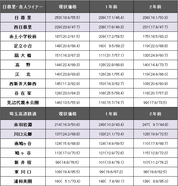 日暮里・舎人ライナー(日暮里~見沼代親水公園)における坪(3.3平方メートル)当たりの平均価格は204万円。1年前に比べて3万円、1.2%上昇した。事例数は578件(前年より71件増)、平均築年数が20.2年(1年前18.3年)、平均専有面積は55.65平方メートル(同54.32平方メートル)。掲載区間内の最高値は日暮里の253万円。