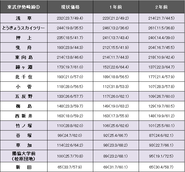 東武伊勢崎線(浅草~伊勢崎)における坪(3.3平方メートル)当たりの平均価格は137万円。1年前に比べて4万円、3.6%上昇した。事例数は3864件(前年より47件減)、平均築年数が23.9年(1年前21.9年)、平均専有面積は59.67平方メートル(同60.96平方メートル)。今回区間の最高値はとうきょうスカイツリーの244万円。