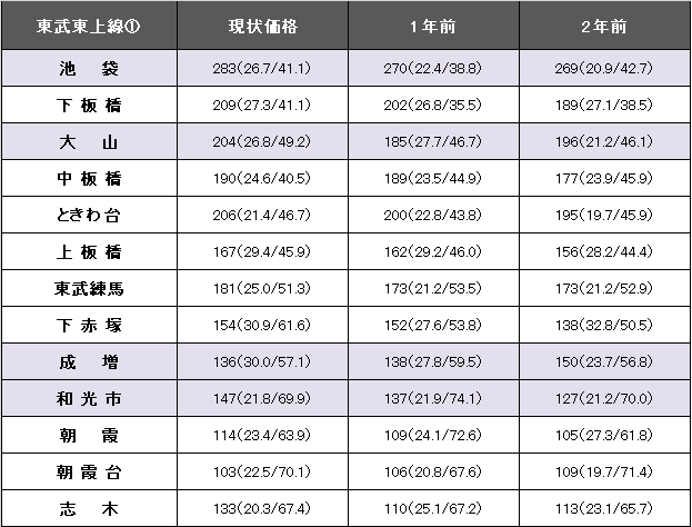 東武東上線(池袋~小川町)における坪(3.3平方メートル)当たりの平均価格は157万円。1年前に比べて10万円、6.8%上昇した。事例数は4376件(前年より56件減)、平均築年数が25.7年(1年前24.5年)、平均専有面積は57.39平方メートル(同57.18平方メートル)。最高値は池袋の283万円。