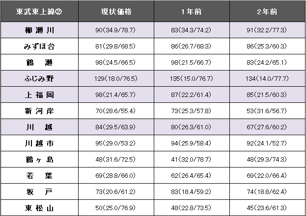 東武東上線(池袋~小川町)における坪(3.3平方メートル)当たりの平均価格は157万円。1年前に比べて10万円、6.8%上昇した。事例数は4376件(前年より56件減)、平均築年数が25.7年(1年前24.5年)、平均専有面積は57.39平方メートル(同57.18平方メートル)。今回区間の最高値はふじみ野の129万円。
