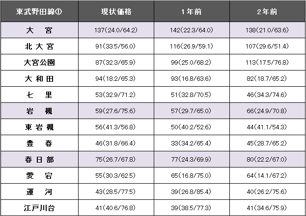 東武野田線(大宮~船橋)における坪(3.3平方メートル)当たりの平均価格は104万円。1年前に比べて3万円、2.4%上昇した。事例数は2295件(前年より133件減)、平均築年数が24.6年(1年前23.6年)、平均専有面積は68.32平方メートル(同68.83平方メートル)。今回区間の最高値は大宮の137万円。