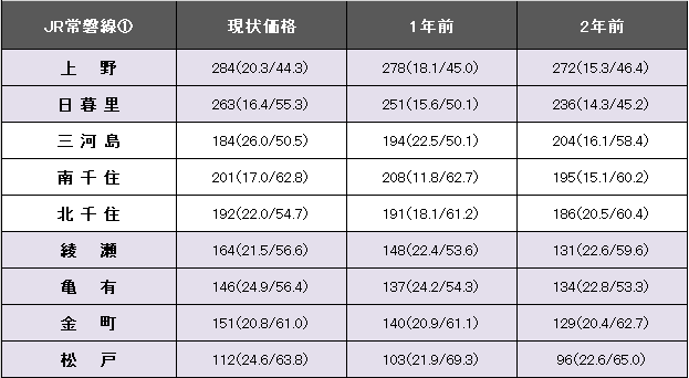 JR常磐線(上野~取手)における坪(3.3平方メートル)当たりの平均価格は141万円。1年前に比べて6万円、4.3%上昇した。事例数は3392件(前年より137件増)、平均築年数が24.2年(1年前22.5年)、平均専有面積は62.20平方メートル(同63.51平方メートル)。今回区間の最高値は上野の284万円。