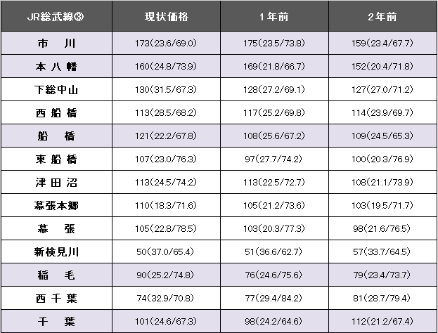 JR総武線(千葉~三鷹)における坪(3.3平方メートル)当たりの平均価格は205万円。1年前に比べて1万円、0.7%上昇した。事例数は8804件(前年より164件減)、平均築年数が25.9年(1年前24.2年)、平均専有面積は55.75平方メートル(同56.49平方メートル)。今回区間の最高値は市川の173万円。