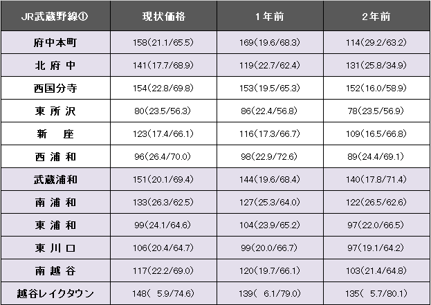 JR武蔵野線(府中本町~西船橋)における坪(3.3平方メートル)当たりの平均価格は111万円。1年前に比べて2万円、2.5%上昇した。事例数は2464件(前年より140件減)、平均築年数が24.9年(1年前23.4年)、平均専有面積は69.11平方メートル(同69.48平方メートル)。今回区間における最高値は府中本町の158万円。