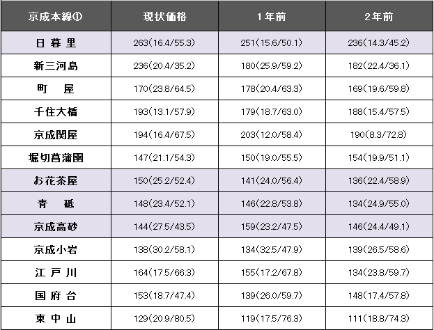 京成本線(京成上野~成田空港)における坪(3.3平方メートル)当たりの平均価格は129万円。1年前に比べて7万円、5.9%上昇した。事例数は1909件(前年より222件減)、平均築年数が25.7年(1年前25.1年)、平均専有面積は62.08平方メートル(同63.45平方メートル)。今回の掲載区間の最高値は日暮里の263万円。