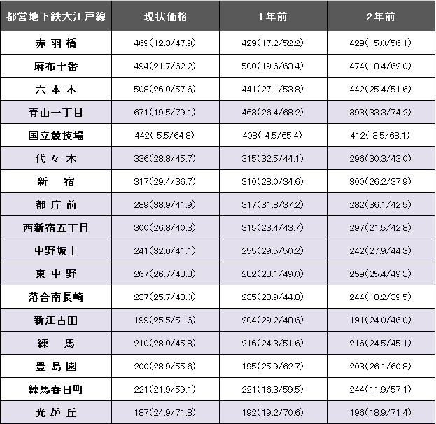 都営地下鉄大江戸線(光が丘~新宿〈放射部〉、新宿~都庁前〈環状部〉)における坪(3.3平方メートル)当たりの平均価格は334万円。1年前に比べて12万円、3.5%上昇した。事例数は6708件(前年より28件増)、平均築年数が22.1年(1年前21.4年)、平均専有面積は53.15平方メートル(同54.07平方メートル)。今回掲載駅(赤羽橋~光が丘)における最高値は青山一丁目の671万円。