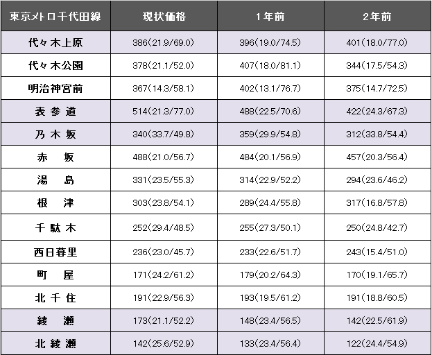 東京メトロ千代田線(代々木上原~北綾瀬)における坪(3.3平方メートル)当たりの平均価格は307万円。1年前と同じだった。事例数は2455件(前件より41件減)、平均築年数が23.7年(1年前22.2年)、平均専有面積は57.82平方メートル(同61.14平方メートル)。掲載区間の最高値は表参道の514万円。