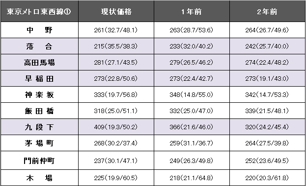 東京メトロ東西線(中野~西船橋)における坪(3.3平方メートル)当たりの平均価格は204万円で、1年前に比べて8万円、3.9%下落した。事例数は4370件(前年より536件減)、平均築年数が28.2年(1年前26.0年)、平均専有面積は59.03平方メートル(同58.98平方メートル)。今回掲載区間(中野~木場)の最高値は九段下の409万円。