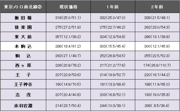 東京メトロ南北線(目黒~赤羽岩淵)における坪(3.3平方メートル)当たりの平均価格は354万円で1年前に比べて9万円、2.7%上昇。事例数は2973件(前年より214件減)、平均築年数が23.0年(1年前22.5年)、平均専有面積は60.09平方メートル(同59.23平方メートル)。今回掲載区間(飯田橋~赤羽岩淵)の最高値は東大前の357万円。