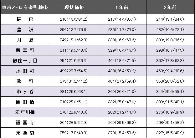 東京メトロ有楽町線(新木場~和光市)における坪(3.3平方メートル)当たりの平均価格は279万円で1年前に比べて3万円、1.2%上昇した。事例数は3680件(前年より272件減)、平均築年数が20.9年(1年前19.8年)、平均専有面積は58.04平方メートル(同58.27平方メートル)。今回掲載区間(辰巳)~東池袋)における最高値は永田町の492万円。