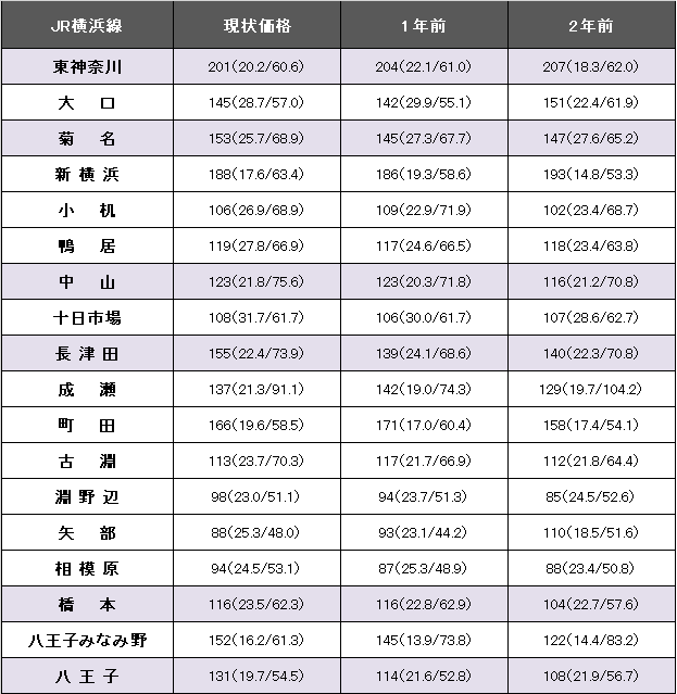 JR横浜線(東神奈川~八王子)における坪(3.3平方メートル)当たりの平均価格は128万円で1年前に比べて2万円、1.9%上昇。事例数は3098件(前年より185件減)、平均築年数が23.4年(1年前23.2年)、平均専有面積は61.05平方メートル(同59.81平方メートル)。掲載区間における最高値は東神奈川の201万円。