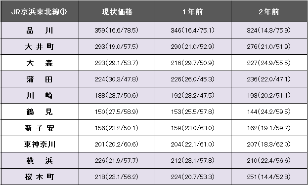 JR京浜東北線(品川~大船)における坪(3.3平方メートル)当たりの平均価格は193万円で1年前に比べて1万円、0.3%下落した。事例数は5934件(前年より273件減)、平均築年数が25.4年(1年前24.4年)、平均専有面積は61.12平方メートル(同58.81平方メートル)。今回区間(品川~桜木町)における最高値は品川の359万円。