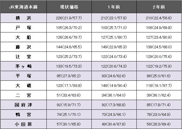 JR東海道本線(横浜~小田原)における坪(3.3平方メートル)当たりの平均価格は126万円で1年前に比べて1万円、0.9%上昇した。事例数は3483件(前年より340件減)、平均築年数が24.8年(1年前24.3年)、平均専有面積は68.50平方メートル(同68.40平方メートル)。掲載区間における最高値は横浜の226万円。
