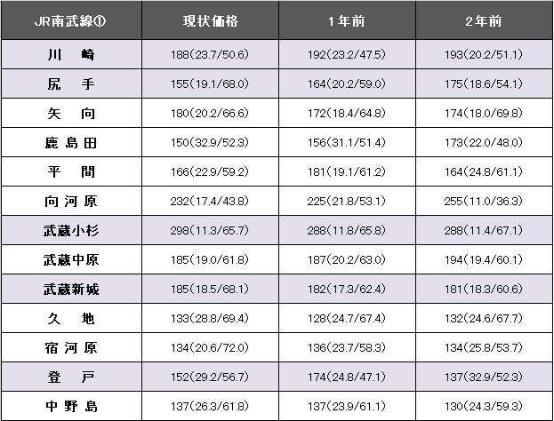 JR南武線(川崎~立川)における坪(3.3平方メートル)当たりの平均価格は185万円で、1年前に比べて10万円、5.1%下落した。事例数は2668件(前年より654件減)、平均築年数が22.1年(1年前20.4年)、平均専有面積は59.52平方メートル(同58.00平方メートル)。今回掲載区間(川崎~中野島)における最高値は武蔵小杉の298万円。