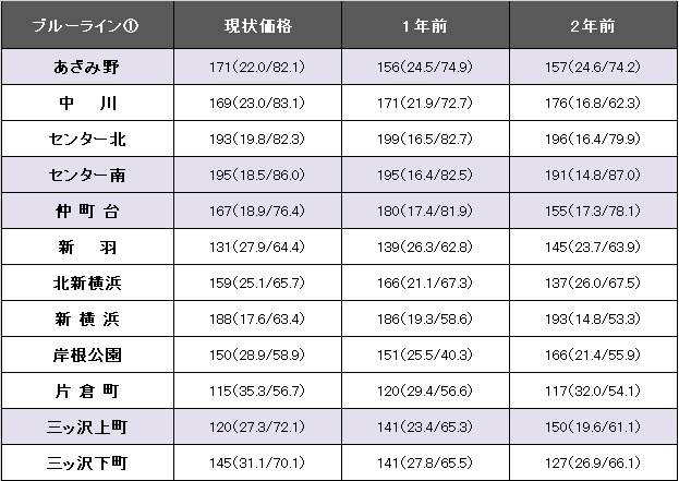 横浜市営地下鉄ブルーライン(あざみ野~湘南台)における坪(3.3平方メートル)当たりの平均価格は156万円で、1年前に比べて1.9%、3万円上昇した。事例数は4757件(前年より337件減)、平均築年数が24.8年(1年前24.2年)、平均専有面積は63.17平方メートル(同61.25平方メートル)。掲載区間(あざみ野~三ツ沢下町)の最高値はセンター南の195万円。