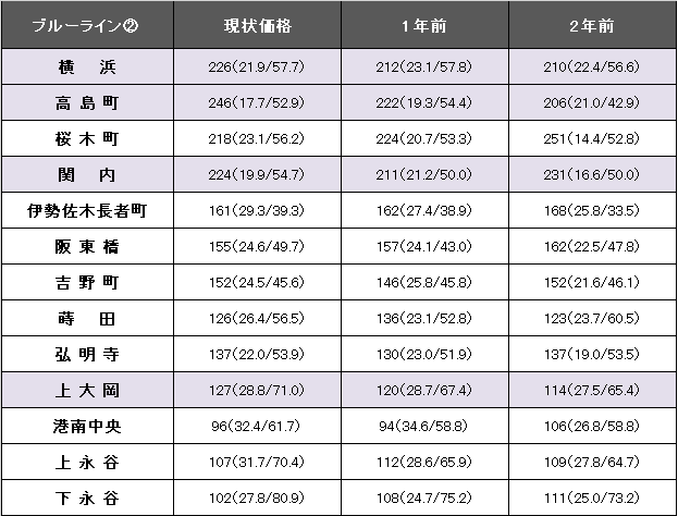 横浜市営地下鉄ブルーライン(あざみ野~湘南台)における坪(3.3平方メートル)当たりの平均価格は156万円で、1年前に比べて1.9%、3万円上昇。事例数は4757件(前年より337件減)、平均築年数が24.8年(1年前24.2年)、平均専有面積は63.17平方メートル(同61.25平方メートル)。掲載区間(横浜~下永谷)の最高値は高島町の246万円。