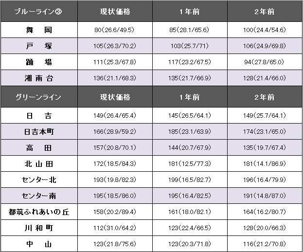 グリーンライン(日吉~中山)における平均坪単価は157万円で、1年前に比べて1万円下落した。事例数は1002件(前年より108件減)、平均築年数が23.6年(1年前22.0年)、平均専有面積は72.26平方メートル(同70.22平方メートル)。同区間内の最高値はセンター南の195万円。