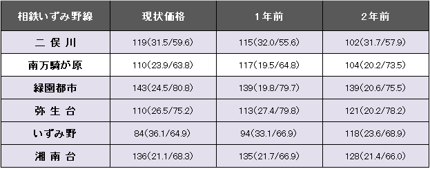 相鉄いずみ野線(二俣川~湘南台)における坪(3.3平方メートル)当たりの平均価格は124万円。1年前に比べて1万円、1.0%上昇した。事例数は465件(前年より88件減)、平均築年数が27.0年(1年前25.8年)、平均専有面積は67.16平方メートル(同65.92平方メートル)だった。掲載駅における最高値は緑園都市の143万円。
