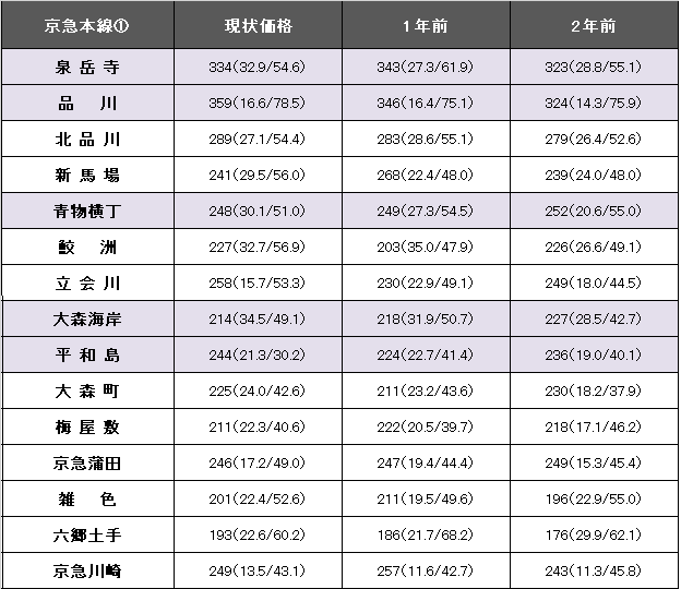 京急本線(泉岳寺~浦賀)における坪(3.3平方メートル)当たりの平均価格は188万円で、1年前から2.5%、5万円上昇した。事例数は4901件(前年より445件減)、平均築年数が24.9年(1年前24.8年)、平均専有面積は59.51平方メートル(同56.72平方メートル)だった。今回掲載区間(泉岳寺~京急川崎)における最高値は品川の359万円。