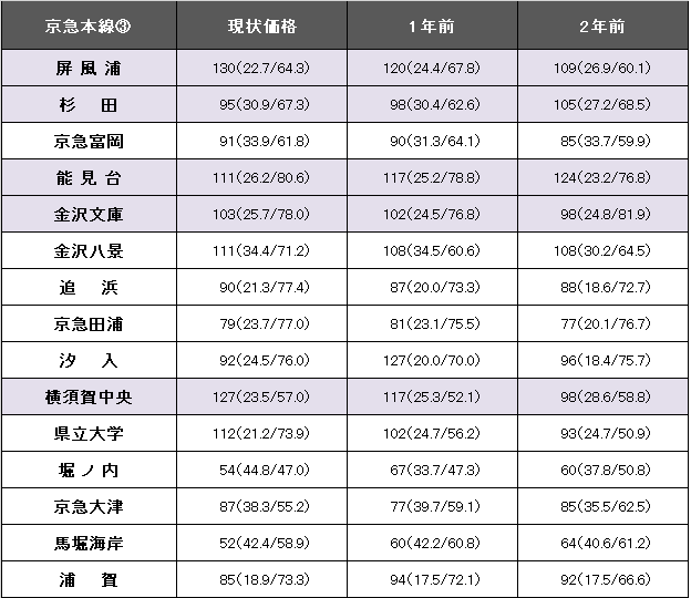 京急本線(泉岳寺~浦賀)における坪(3.3平方メートル)当たりの平均価格は188万円で、1年前から2.5%、5万円上昇した。事例数は4901件(前年より445件減)、平均築年数が24.9年(1年前24.8年)、平均専有面積は59.51平方メートル(同56.72平方メートル)だった。今回掲載区間(屛風浦~浦賀)における最高値は屛風浦の130万円。