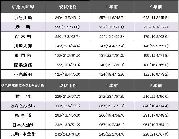 京急大師線(京急川崎~小島新田)における坪(3.3平方メートル)当たりの平均価格は183万円で、1年前から10万円上昇した。事例数は308件(前年より66件減)、平均築年数が16.1年(1年前17.3年)、平均専有面積は61.04平方メートル(同58.04平方メートル)だった。