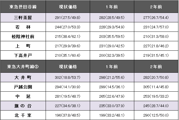 東急世田谷線(三軒茶屋~下高井戸)における坪(3.3平方メートル)当たりの平均価格は272万円で、1年前から12万円上昇した。事例数は666件(前年より119件減)、平均築年数が29.1年(1年前29.4年)、平均専有面積は51.40平方メートル(同49.54平方メートル)だった。同区間の最高値は三軒茶屋の291万円。