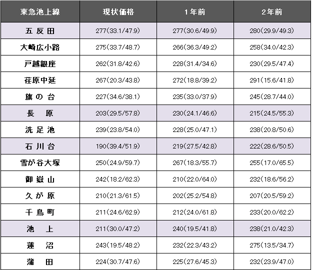 東急池上線(五反田~蒲田)の平均坪単価は239万円で、1年前から1.3%、3万円下落した。事例数は1544件(前年より247件減)、平均築年数が29.7年(1年前26.2年)、平均専有面積は49.58平方メートル(同47.03平方メートル)。掲載区間における最高値は五反田の277万円。